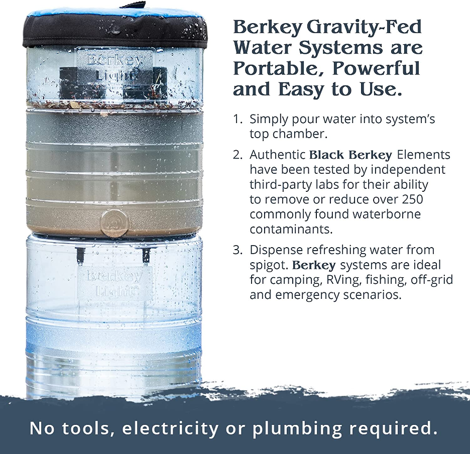 The Big Berkey is easy to use, with no plumbing or electricity required. Simply pour in 8.5 liters of untreated water (or less), and it will take care of the rest!