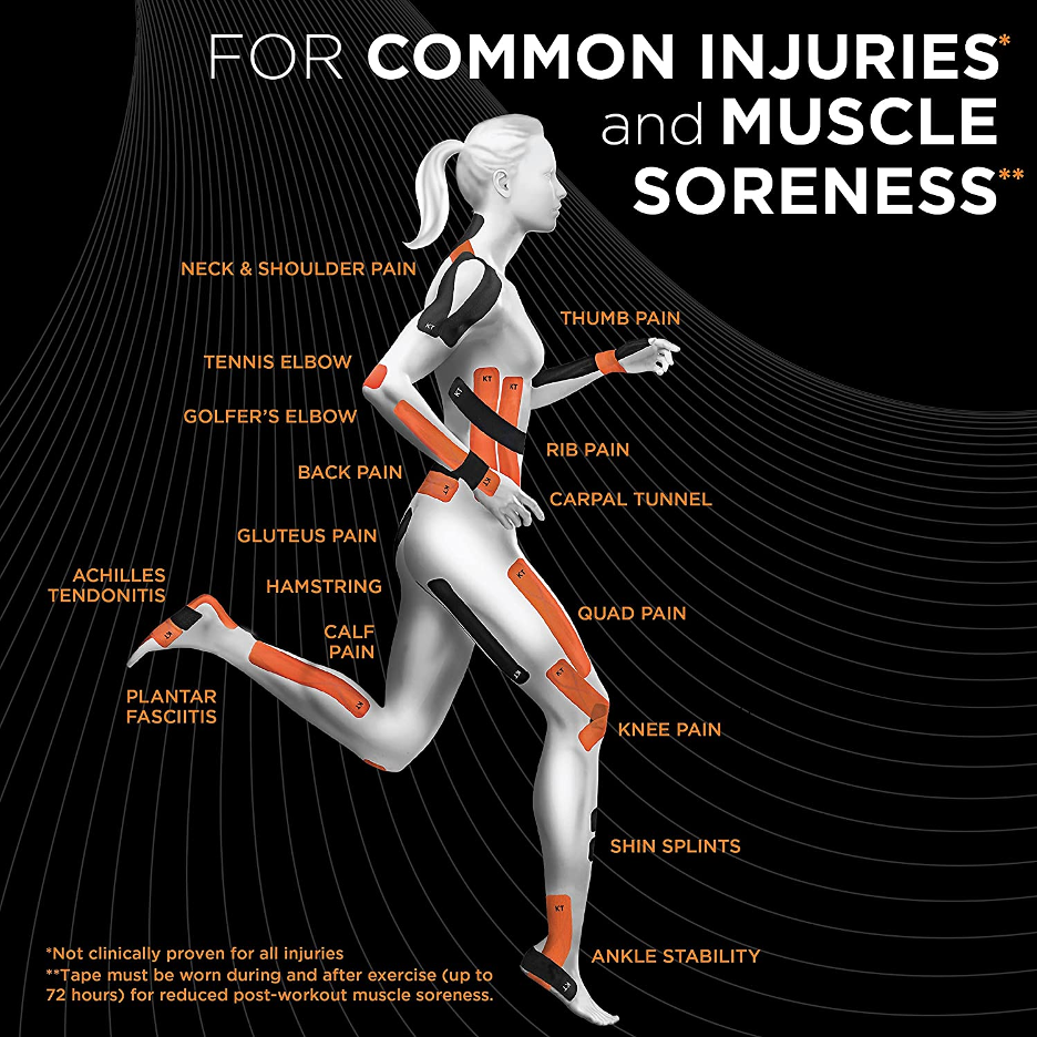 The wide KT SPORTS Tape is specifically designed for muscle injury relief throughout your body, ranging from upper shoulder injuries down to lower back pain.