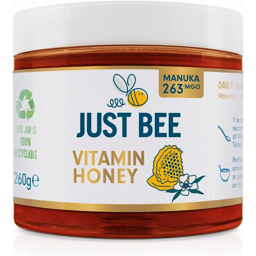 Introducing Just Bee Raw Vitamin Manuka Honey (263 MGO). This delicious, certified pure New Zealand honey is rich in essential vitamins and minerals that will help support your body's immune system.