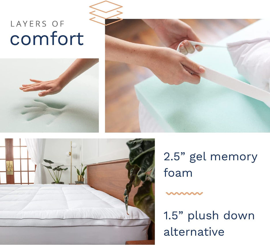 Crafted from 2.5 inches of temperature-neutral gel memory foam and 1.5 inches of luxurious down alternative material, it provides an additional plush layer for maximum comfort each night you drift off into dreamland.