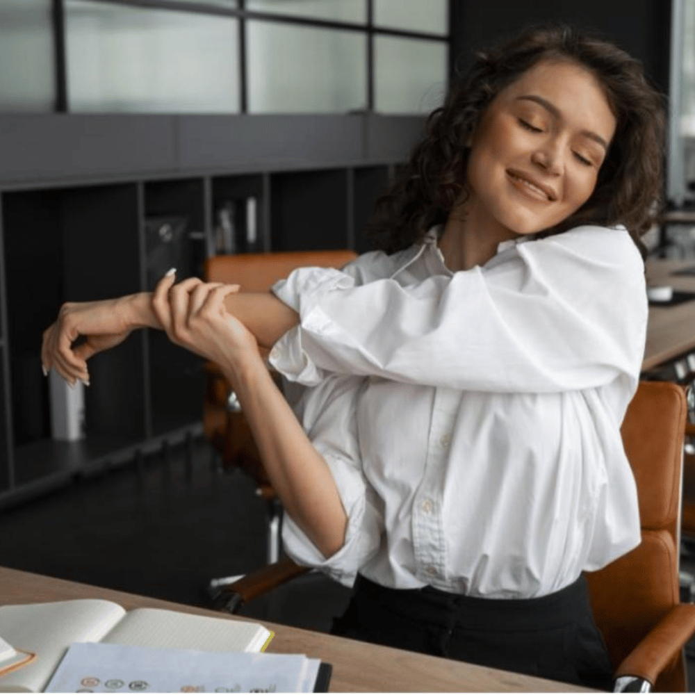 Following is the range of stretches specifically curated to address the everyday tension and discomfort experienced by office workers due to prolonged sitting and desk-bound tasks.