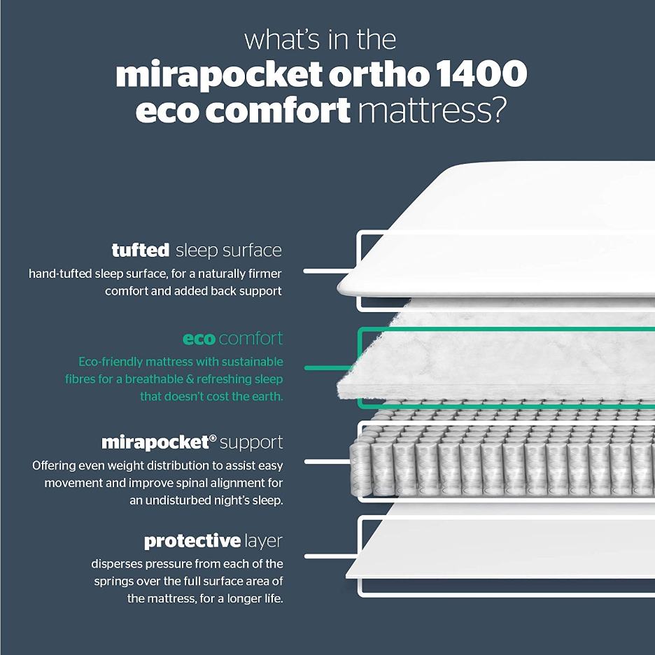 Not to mention, it is completely foam and chemical treatment free. Its Mirapocket layer uses 1400 pocket springs that work individually in response to your movement, delivering tailored support all night long.