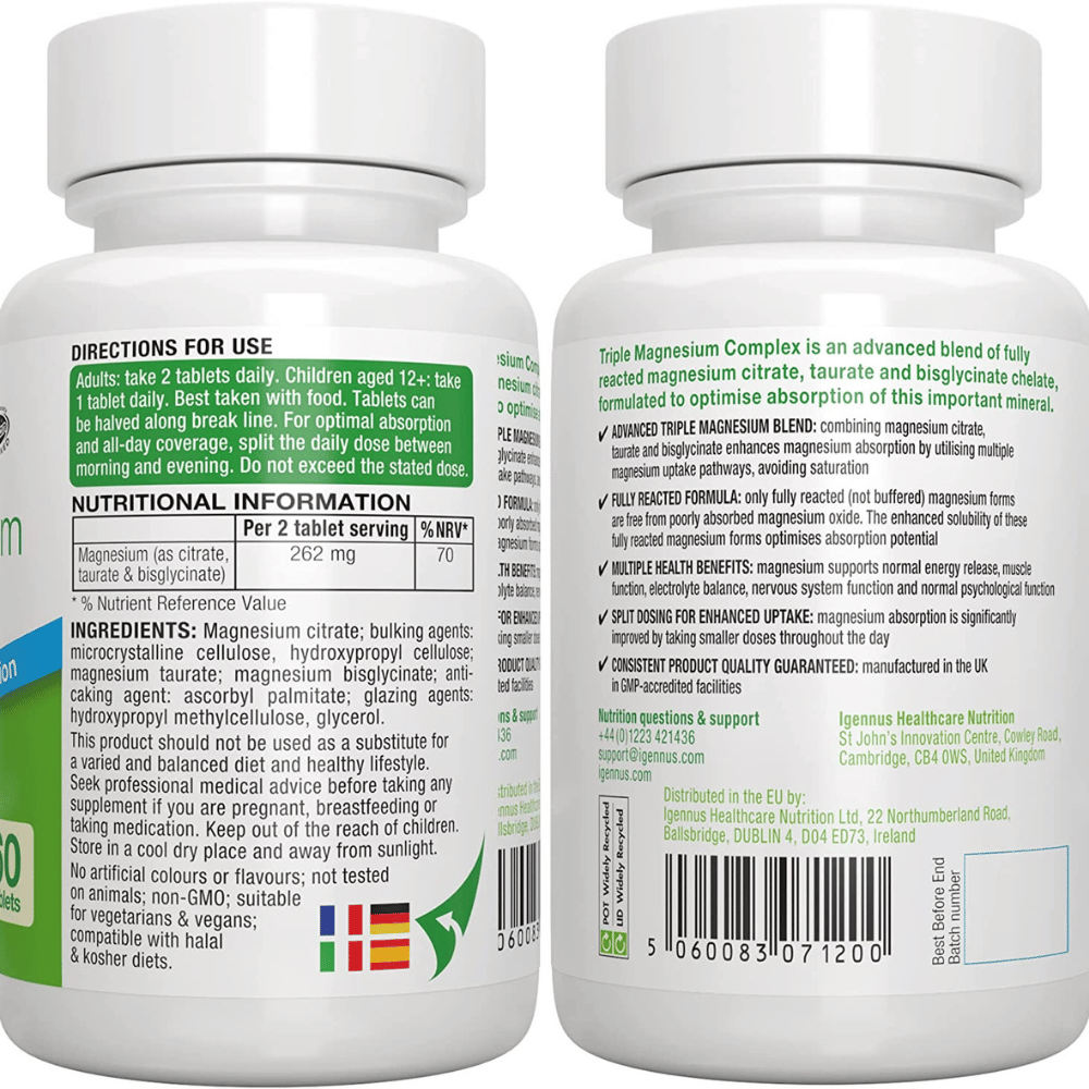 #2. Triple Magnesium Complex, 2000mg Magnesium Citrate, Bisglycinate & Taurate, Providing 262mg Elemental Magnesium, 60 Tablets