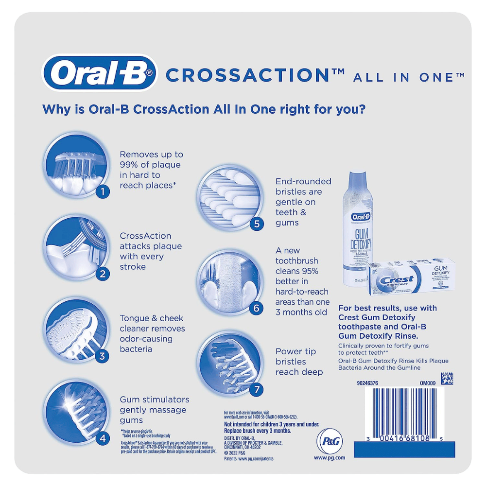 Welcome to Oral-B Pro CrossAction All In One Soft Toothbrushes, Deep Plaque Removal; the perfect toothbrush for eliminating plaque and keeping your gums healthy. This set of 6 power brushes gives your total protection from plaque buildup - getting rid of up to 99% of it in those hard-to-reach places.